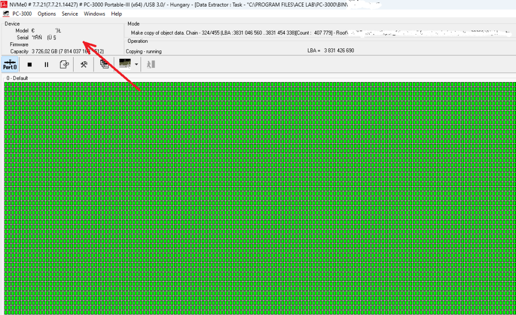 Sikeres adatmentés készült egy Samsung 4TB-os NVMe SSD-ről, ami ráadásul az adatmentő hardver-szoftver által nem is támogatott. De a szakmai tapasztalatok, na meg néhány szakmai fogásnak köszönhetően sikeresen zárult. A második képen, ahol zöld kis négyzetek tömkelege is látható, a bal felső sarokban (piros nyíl is mutat oda) , szóval jól látható, hogy az NVMe SSD azonosítója nem is volt detektálható, csak „krix-krax” karakterek jelentek meg, a kapacitás pedig kézzel lett beállítva.